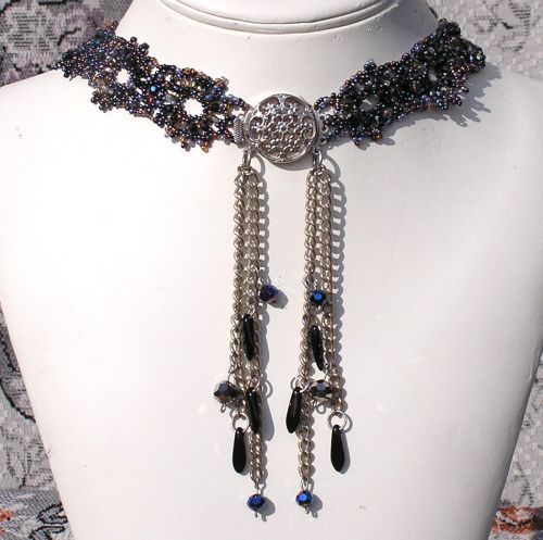 A nyakék 118 db swarovski kristály gyöngyöt tartalmaz. 10 hullám öleli körbe a nyakat és egy ovál van a nyakék közepén. Az ékszer matt és csillogó lila valamint piros színekből áll. Nagyon szépen rásimúl a nyakra, nagyon kényelmes viselet.