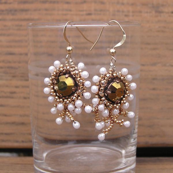 16 szírmú margaréta virág üveggyöngyökből. A virágokon vegyesen vannak csiszolt üveggyöngyök vagy swarovski kistályok elhelyezve. A nyaklánc acél sodronyra fűzött gyöngyökbál áll. Azáródások nemesacélból vannak. A fülbevaló azonos típusú gyöngyökböl készült egyenként a láncokhoz. A fülbevaló szereléke szintén nemesacélból van.